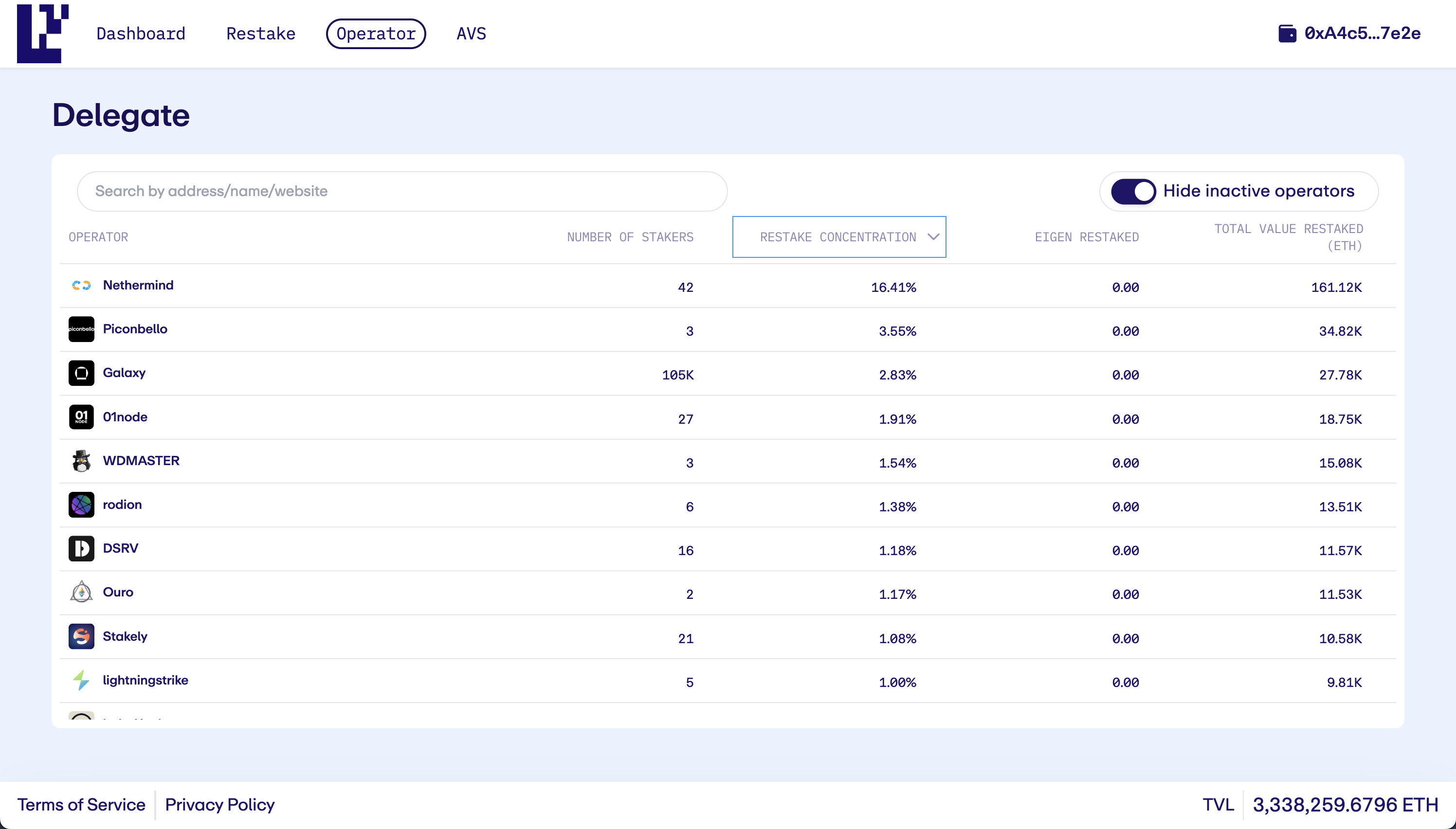 Follow the steps below to initiate delegation of your Restaked balance to an Operator of your choice. This Restaked balance includes EIGEN tokens, LST tokens, and Native Restaked TVL.